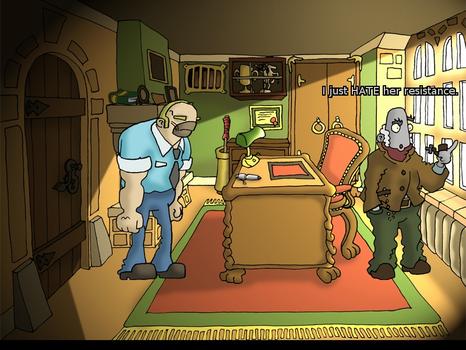 Edna & Harvey: The Breakout is an adventure game in the same vein as LucasArts' pre-1994 games created using the SCUMM engine. The game screen shows a two-dimensional cartoon world where Edna, the playable character is incarcerated within a mental hospital. The bottom edge of the screen contains a list of verbs which must be clicked on before the player clicks on an item within the game world in order to manipulate it. When the player tries to combine or effect one item with another each combination produces a different response, unlike in most games of this type where an incorrect combination would result in a response of "I don't know why you'd want to do that." During play expensive in-game objects such as cars can be defaced by the player, this does not affect the game in any tangible way but represents an act of rebellion